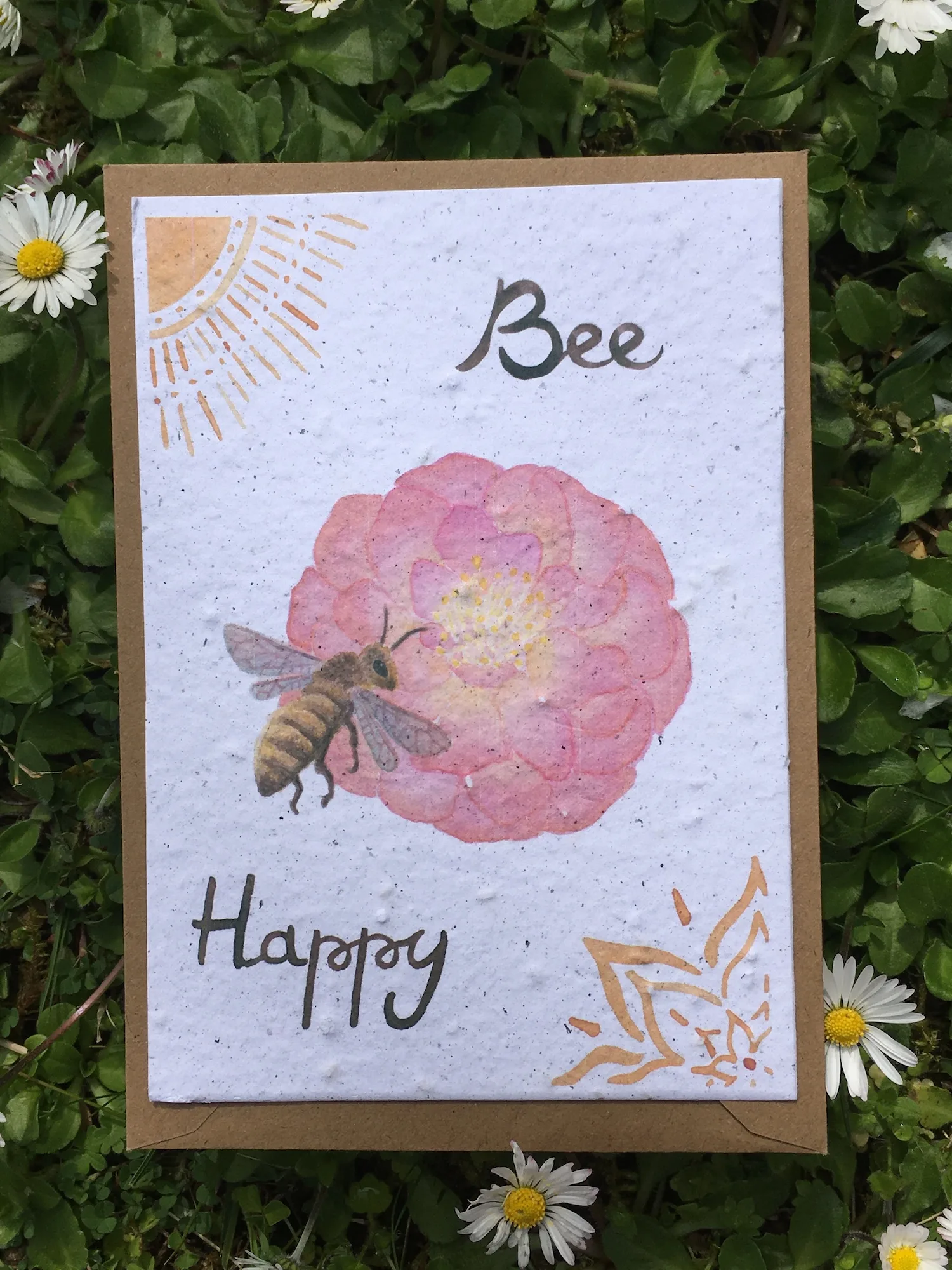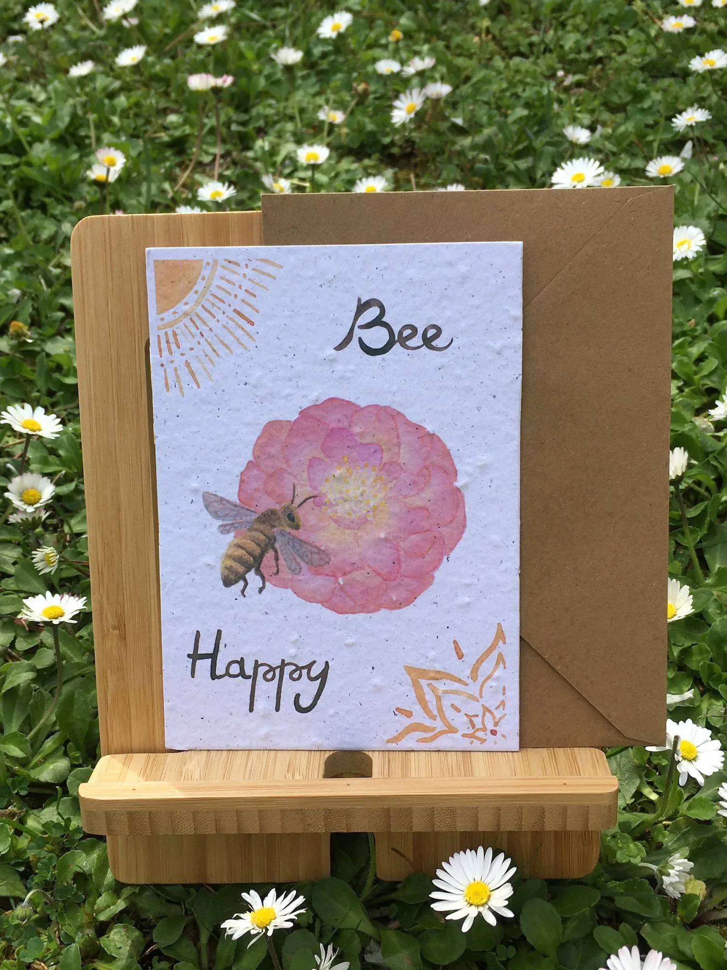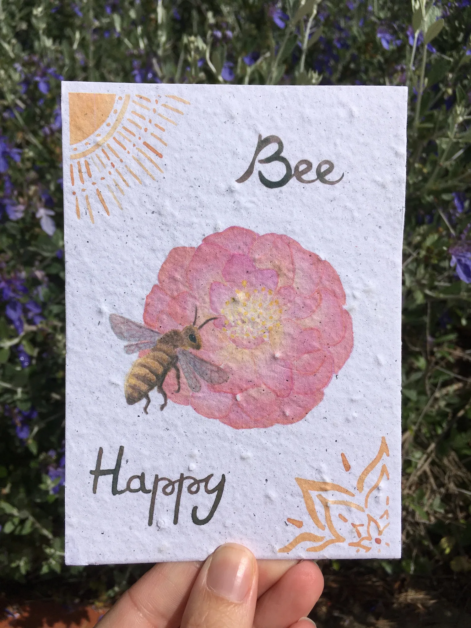Cartes imprimées artisanalement en France avec de la pâte à papier recyclé, des graines de fleurs mellifères françaises et sans OGM, et des encres végétales sans solvant.