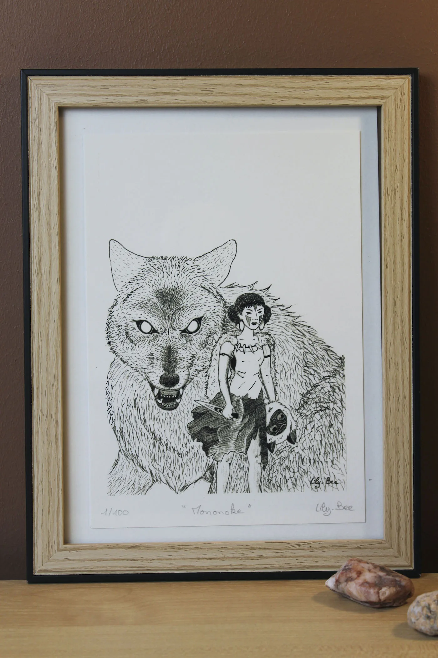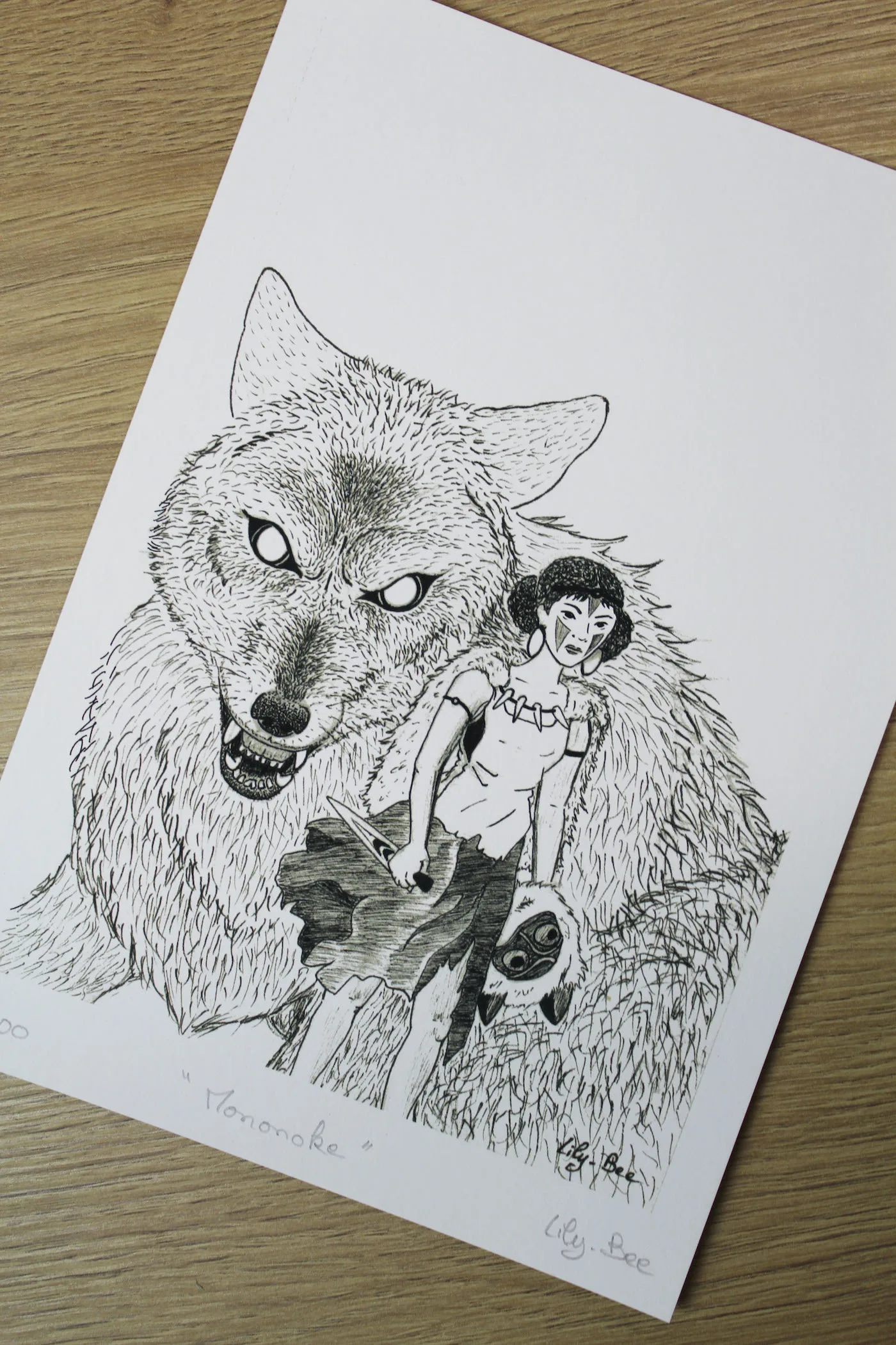Inspiré du film d’animation de Hayao Miyazaki « Princesse Mononoké » (Mononoké Hime en japonais, soit « Princesse des Esprits »), ce dessin reprend dans un style qui m’est propre l’affiche du film. C’est un hommage au studio Ghibli qui met au coeur de ses oeuvres la place de la Nature et des Esprits dans la vie des hommes.